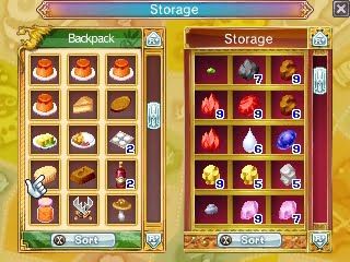 If there’s something I’ve learned in the Harvest Moon and Rune Factory games, then it’s that you have to hoard as much as you can. No matter that it means that you are seriously short on in-game money in the beginning, you must make sure that you save as much as you can. Because you never know when you need a certain item to make a dish or a recipe.  Generally I’m satisfied that I have enough by the time that I have 3 slots filled with 9 items of the same, so 3×9 iron, or for each colored grass. Somehow it gives me such a happy feeling doing that, maybe because it feels so rich to hoard all this stuff.